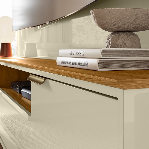 O Home Theater Nilo Com Pés – Madetec Móveis une elegância, funcionalidade e acabamento premium. Possui uma gaveta com corrediças telescópicas e duas portas com dobradiças metálicas, garantindo suavidade no uso e longa durabilidade. O painel com detalhes curvos e os puxadores em bronze trazem requinte, enquanto o tampo e a prateleira superior com borda chanfrada complementam o visual sofisticado.